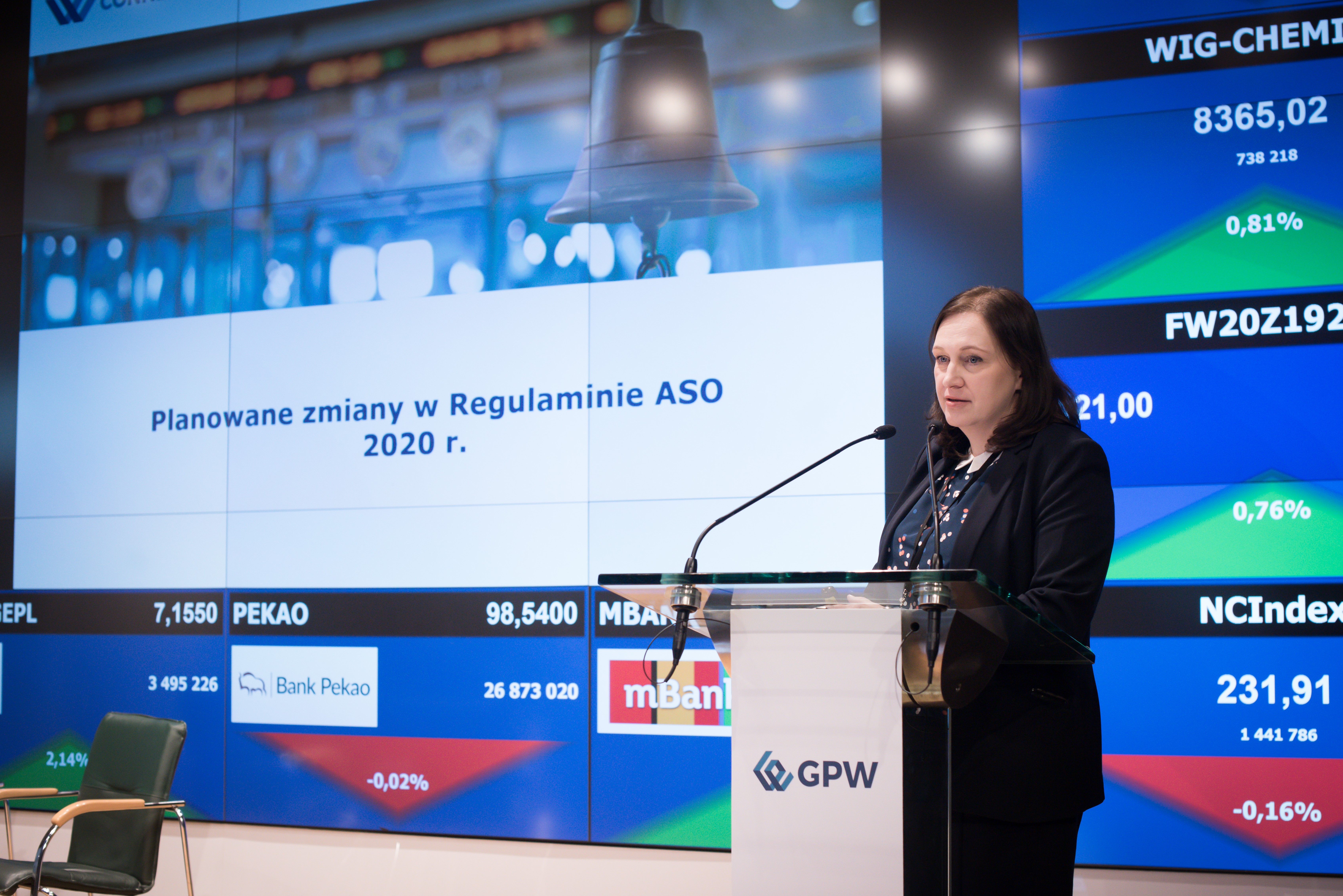 Agnieszka Góral, wicedyrektor Działu Emitentów GPW, przybliżyła uczestnikom seminarium planowane zmiany w Regulaminie ASO dotyczące zasad wprowadzania instrumentów finansowych do ASO i obowiązków emitentów notowanych w ASO. Omówiła również zmiany w zasadach kwalifikowania spółek do segmentów rynku NewConnect, które wejdą w życie w 2020 r.