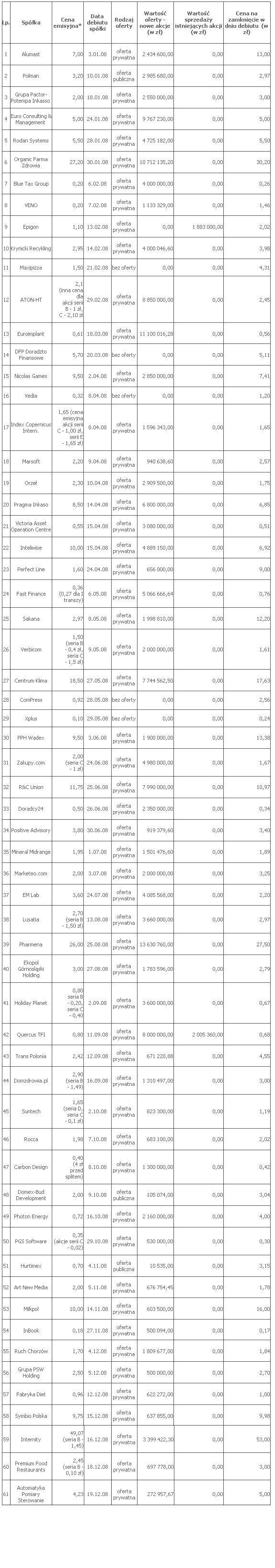 Czytaj więcej ZwińLp. Spółka Cena emisyjna* Data debiutu spółki Rodzaj oferty Wartość oferty - nowe akcje (w zł) Wartość oferty (w zł) Cena na zamknięcie w dniu debiutu (w zł) 1 Uboat Line 1,00 03.01.12 oferta prywatna 2 502 000,00 2 502 000,00 0,73 2 Internet Media Services 1,60 04.01.12 oferta prywatna 0,00 14 000,00 1,07 3 SFD 0,14 09.01.12 oferta prywatna 1 158 400,00 1 158 400,00 0,23 4 Socializer 11,50 16.01.12 oferta prywatna 730 595,00 730 595,00 17,25 5 Tilia 40,00 17.01.12 oferta prywatna 0,00 1 550 000,00 53,00 6 Quart Development 3,00 19.01.12 oferta prywatna 990 000,00 990 000,00 3,90 7 4Studio 0,88 31.01.12 oferta prywatna 600 002,00 600 002,00 0,65 8 5th Avenue Holding 1,70 01.02.12 oferta prywatna 6 902 000,00 7 023 500,00 1,70 9 Mobile Factory 2,00 02.02.12 oferta prywatna 330 000,00 390 000,00 2,40 10 M10 0,10 06.02.12 oferta prywatna 1 600 000,00 1 600 000,00 11 Fachowcy.pl Ventures 1,32 15.02.12 oferta prywatna 608 000,00 3 918 510,00 1,63 12 Partner-Nieruchomości 0,14 16.02.12 oferta prywatna 1 680 000,00 1 680 000,00 0,11 13 KOPAHAUS 0,70 17.02.12 oferta prywatna 4 200 000,00 4 200 000,00 0,95 14 Playmakers 0,22 23.02.12 oferta prywatna 203 162,74 203 162,74 0,38 15 Aduma 12,00 24.02.12 oferta prywatna 2 375 837,40 2 375 837,40 14,77 16 Modecom 20,00 28.02.12 oferta prywatna 2 657 000,00 2 657 000,00 16,50 17 Kinomaniak 0,35 09.03.12 oferta prywatna 560 000,00 560 000,00 0,44 18 Telecom Media 6,00 13.03.12 oferta prywatna 1 040 000,00 1 040 000,00 4,80 19 The Farm 51 Group 6,40 14.03.12 oferta prywatna 2 645 088,50 2 645 088,50 3,78 20 Mode 1,02 16.03.12 oferta prywatna 64 482,36 64 482,36 1,05 21 Edison 1,30 30.03.12 oferta prywatna 390 000,00 390 000,00 1,95 22 Internet Union 1,00 03.04.12 oferta prywatna 445 000,00 445 000,00 1,69 23 Auto-Spa 10,97 12.04.12 oferta prywatna 1 399 322,23 1 399 322,23 8,36 24 TWIGONET 3,45 13.04.12 oferta prywatna 6 715 886,00 6 715 886,00 3,68 25 Leśne Runo 1,00 23.04.12 oferta prywatna 500 000,00 750 000,00 1,13 26 eo Networks 11,31 25.04.12 oferta prywatna 300 281,00 2 529 819,00 18,90 27 Guardier 2,00 26.04.12 oferta prywatna 300 000,00 300 000,00 1,76 28 Grupa Mennice Krajowe 10,00 11.05.12 oferta prywatna 401 000,00 401 000,00 10,55 29 STOCKinfo 0,99 14.05.12 oferta prywatna 471 000,00 471 000,00 0,99 30 Cloud Technologies 1,20 18.05.12 oferta prywatna 360 000,00 360 000,00 1,86 31 Forposta 11,00 22.05.12 oferta prywatna 5 000 006,00 5 000 006,00 14,60 32 K&K Herbal Poland 1,20 24.05.12 oferta prywatna 214 800,00 369 800,00 2,16 33 Ekokogeneracja 0,77 25.05.12 oferta prywatna 2 383 012,00 3 172 516,00 0,80 34 Indexmedica 3,10 28.05.12 oferta prywatna 930 000,00 930 000,00 3,29 35 Triceps.pl 2,20 04.06.12 oferta prywatna 562 250,00 562 250,00 2,72 36 AlejaSamochodowa.pl 0,1 06.06.12 oferta prywatna 950 000,00 950 000,00 0,15 37 V Group 11,00 08.06.12 oferta prywatna 3 751 000,00 3 751 000,00 14,00 38 VIVID Games 0,34 11.06.12 oferta prywatna 2 992 000,00 2 992 000,00 0,30 39 Apache Quest 0,70 12.06.12 oferta prywatna 421 500,00 421 500,00 1,25 40 Kancelaria Medius 0,10 13.06.12 oferta prywatna 436 000,00 436 000,00 0,10 41 Ostatniemiejsca.pl 1,00 15.06.12 oferta prywatna 587 000,00 587 000,00 1,52 42 Inventi 0,54 15.06.12 oferta prywatna 260 280,00 260 280,00 0,69 43 Aedes 1,42 18.06.12 oferta prywatna 1 003 130,60 1 003 130,60 1,90 44 Reklamofon 0,13 19.06.12 oferta prywatna 343 564,91 343 564,91 0,10 45 Your Image 0,65 20.06.12 oferta prywatna 570 500,00 570 500,00 0,70 46 Admassive 7,00 21.06.12 oferta prywatna 2 450 000,00 2 450 000,00 7,80 47 Velto 0,60 25.06.12 oferta prywatna 1 680 000,00 1 680 000,00 0,39 48 Baby 0,45 26.06.12 oferta prywatna 288 864,00 455 152,45 0,75 49 Les Tech-Homes 1,25 27.06.12 oferta prywatna 6 100 000,00 6 100 000,00 1,10 50 Browar Gotyniec 20,00 04.07.12 oferta prywatna 3 572 000,00 3 572 000,00 21,94 51 Baumal Group 2,00 05.07.12 oferta prywatna 1 200 000,00 1 400 000,00 3,00 52 Elemental Holding 1,57 12.07.12 oferta prywatna 10 806 826,53 10 806 826,53 2,35 53 Coleos 1,00 17.07.12 oferta prywatna 1 000 000,00 1 600 000,00 1,45 54 Mostostal Wrocław 1,00 18.07.12 oferta prywatna 16 000 000,00 16 000 000,00 1,42 55 Esperotia Energy Investments 0,45 19.07.12 oferta prywatna 2 579 581,65 2 579 581,65 0,41 56 piLAB 2,00 20.07.12 oferta prywatna 300 000,00 300 000,00 3,60 57 FLY.PL 0,50 27.07.12 oferta prywatna 750 000,00 750 000,00 0,90 58 Elkop Energy 777,77 27.07.12 oferta publiczna 1 944 445,00 1 944 445,00 1333,20 59 Planet Soft 2,00 07.08.12 oferta prywatna 0,00 755 000,00 2,00 60 MADKOM 0,20 09.08.12 oferta prywatna 1 000 000,00 1 000 000,00 0,27 61 Merit Invest 2,00 22.08.12 oferta prywatna 309 000,00 309 000,00 2,80 62 Laser - Med 1,15 29.08.12 oferta prywatna 71 300,00 71 300,00 1,30 63 SterGames 0,60 30.08.12 oferta prywatna 300 000,00 300 000,00 1,08 64 Prymus 2,60 31.08.12 oferta prywatna 0,00 260 000,00 3,10 65 SFK Polkap 4,50 31.08.12 oferta prywatna 0,00 214 200,00 3,80 66 EBC Solicitors 2,00 04.09.12 oferta prywatna 2 000 000,00 2 335 000,00 1,83 67 Revitum 3,00 05.09.12 oferta prywatna 198 000,00 198 000,00 2,20 68 Presto 0,15 13.09.12 oferta prywatna 600 000,00 600 000,00 0,31 69 Biofactory 2,20 19.09.12 oferta prywatna 708 400,00 708 400,00 2,39 70 Termo-Rex 0,10 24.09.12 oferta prywatna 0,00 1 811 300,00 0,15 71 Unimot Gaz 2,85 26.09.12 oferta prywatna 295 821,45 295 821,45 3,00 72 ICP Group 2,35 27.09.12 oferta prywatna 511 049,80 511 049,80 2,85 73 WakePark 0,58 28.09.12 oferta prywatna 878 500,00 878 500,00 0,25 74 Art & Business Magazine 1,00 02.10.12 oferta prywatna 0,00 2 538 319,40 1,39 75 Techmadex 26,00 04.10.12 oferta prywatna 252 200,00 252 200,00 27,95 76 IBC Polska F&P 5,25 25.10.12 oferta prywatna 629 031,00 629 031,00 6,09 77 Macro Games 2,00 26.10.12 oferta prywatna 500 000,00 500 000,00 2,00 78 Beskidzkie Biuro Consultingowe 3,00 22.11.12 oferta prywatna 3 525 000,00 3 525 000,00 3,44 79 JR Invest 6,50 28.11.12 oferta prywatna 3 947 885,50 3 947