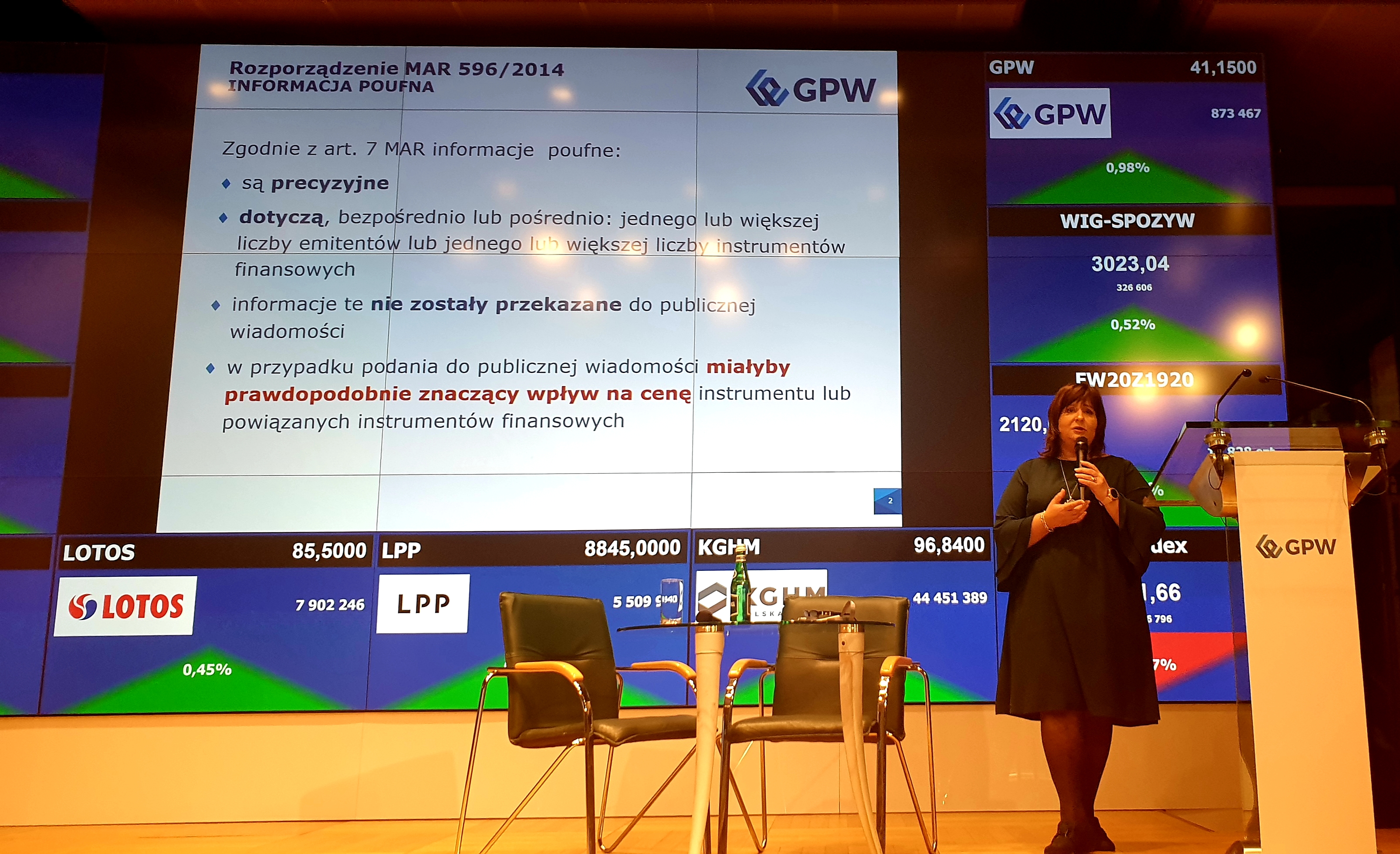 Agnieszka Gontarek, dyrektor Działu Emitentów GPW, przedstawiła praktyczne aspekty przestrzegania przez spółki z NewConnect i Catalyst przepisów i regulacji obowiązujących w ASO, w tym kwestie związane z nakładaniem przez Giełdę kar regulaminowych na emitentów nieprzestrzegających przepisów Regulaminu ASO. Podkreślając, że rzetelne i prawidłowe wypełnianie obowiązków informacyjnych przez spółki stanowi podstawę komunikowania się z inwestorami, A. Gontarek przypomniała także podstawowe obowiązki emitentów ASO wynikające z Rozporządzenia MAR, kładąc szczególny nacisk na praktyczne aspekty definicji informacji poufnej. Zwróciła także uwagę na rolę Autoryzowanych Doradców. Nie zabrakło również zapewnienia, że Giełda, w trosce o jakość i przejrzystość ASO MŚP, a tym samym zaufanie do tego rynku, przywiązuje dużą wagę do działań edukacyjnych i nadzorczych nakierowanych na podnoszenie standardu raportów publikowanych przez spółki z NewConnect.